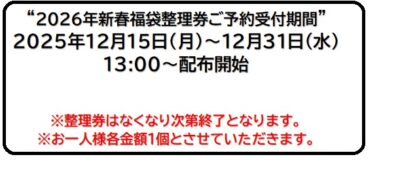 2026年度の新春福袋(初売り福袋)の販売方法を、『購入ご予約券・配布方式』とさせて頂きます。