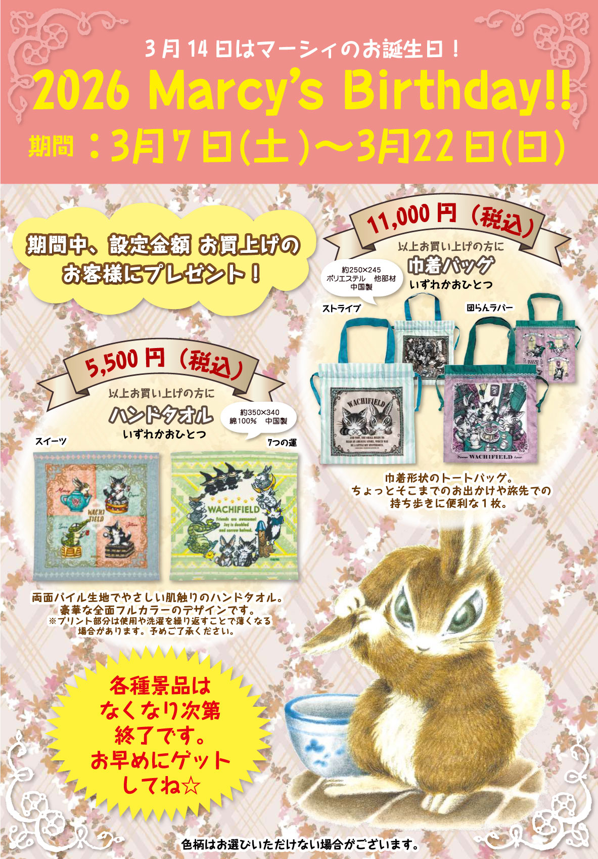 - 11,000円(税込)以上のお買上げで、巾着バッグをいずれか1つ