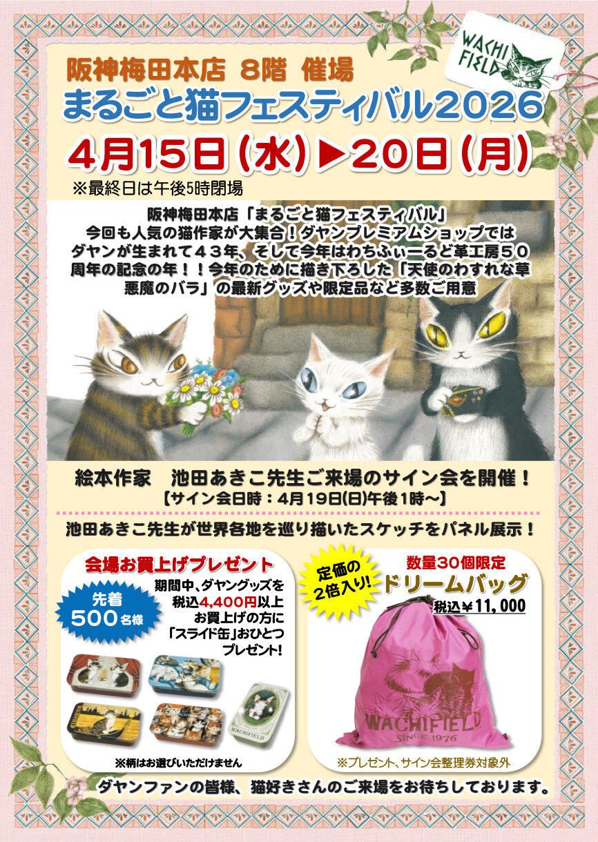 猫のダヤンプレミアムショップでは、作家池田あきこが世界を巡り描いたスケッチアートを表現したパネルの展示!!スペシャルイベント「池田あきこサイン会」も賑やかに開催♪スケッチ版画や新作ジクレー版画の展示販売など見どころたっぷり♪今年のために描き下ろした「天使のわすれな草 悪魔のバラ」シリーズや新作グッズの販売と盛りだくさん!!池田あきこに会えるチャンス!ダヤンファンの皆様、猫好きさんご来場をお待ちしております。