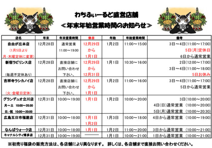 ~直営店年末年始営業時間のお知らせ~